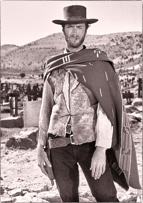Y ahí llegamos al poncho, esa prenda tan peculiar, que es la que lo identifica plenamente. Parece ser que lo compró Clint en España, y se empeñó en ponerlo para el rodaje. Fue una gran idea. El poncho, combinado con el sombrero, el cigarro, la mirada oblicua, enigmática, el colt, ese instrumento quirúrgico incluso, que actúa preciso y sin retórica, los vaqueros ajustados, las botas camperas y las espuelas, la expresión hierática, el andar lento y ritual (acompasado por la música solemne de Morricone imitando pasos de Semana Santa), y ese anonimato radical lo convierten en un símbolo.