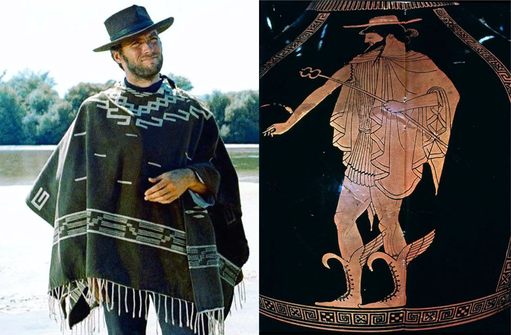 El enigma del Sin nombre tiene raíces mitológicas griegas, creo yo. Es un mediador que procede de otro mundo. Entre los griegos el gran mediador es Hermes, el dios mensajero, Mercurio para los romanos. Una mínima indagación acerca de los parecidos genera asombro, y comienza uno a pensar que no es casualidad, que quizás Sergio Leone, o tal vez el propio Clint Eastwood, está inspirado explícitamente en él. Veamos: