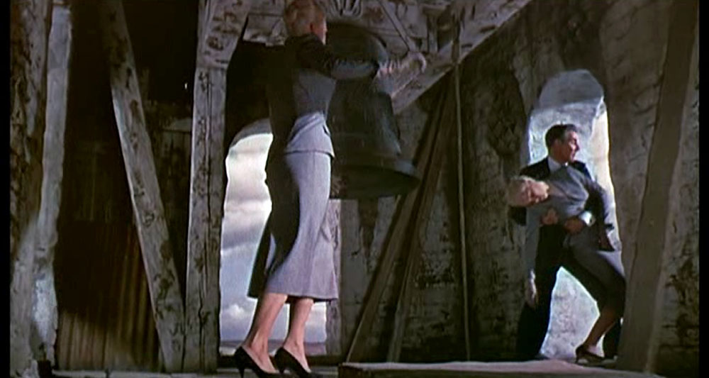 Cuando va a visitarlo de madrugada fingiéndose atormentada por la pesadilla, ella está dirigiendo sus pasos hacia la misión. La torre es la clave, y el vértigo. Ella sube, pero él no puede. Hitchcock reconoce que la novela tiene aquí su principal fallo, no hay manera de saber que efectivamente Scottie no subirá, el vértigo no es suficiente. Pero esa licencia poética debe funcionar.